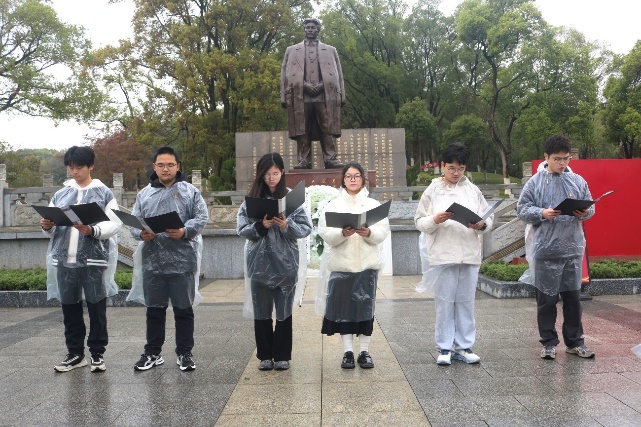在方志敏烈士雕塑下,全体党员同志和团员青年整齐列队,怀着崇敬之心,为方志敏烈士献上花束并致以诚挚地三鞠躬。全体成员诵读《可爱的中国》 片段,领悟以爱国、创造、清贫、奉献为内涵的方志敏精神。